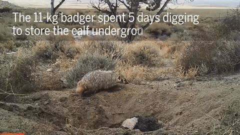 Những hình ảnh cho thấy để chôn được con bò, con lửng một mình âm thầm dùng các chi đào bới đất xung quanh và bên dưới con bò. Công việc hoàn tất trong năm ngày làm việc chăm chỉ của nó.