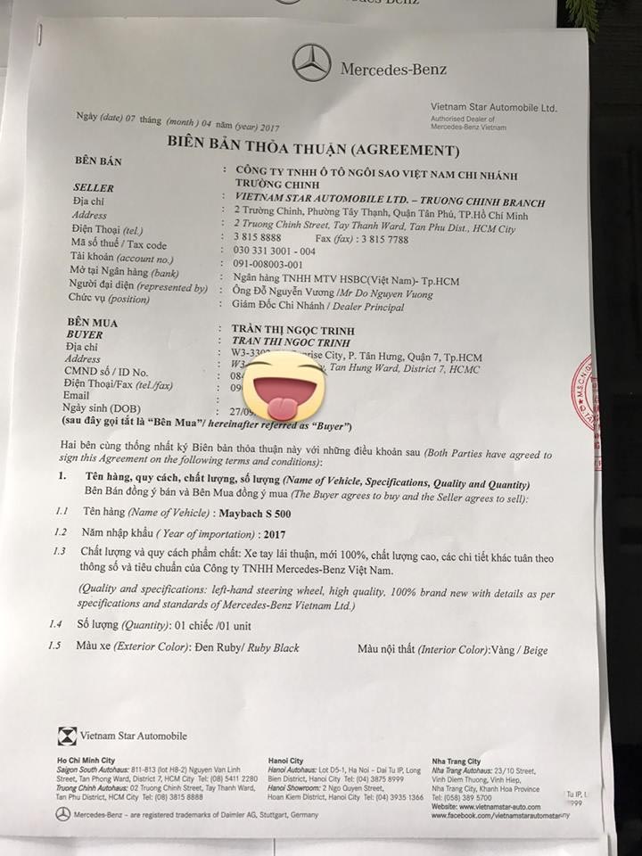 Giấy tờ được đơn vị bán xe cho Ngọc Trinh tung ra làm bằng chứng giúp khách hàng