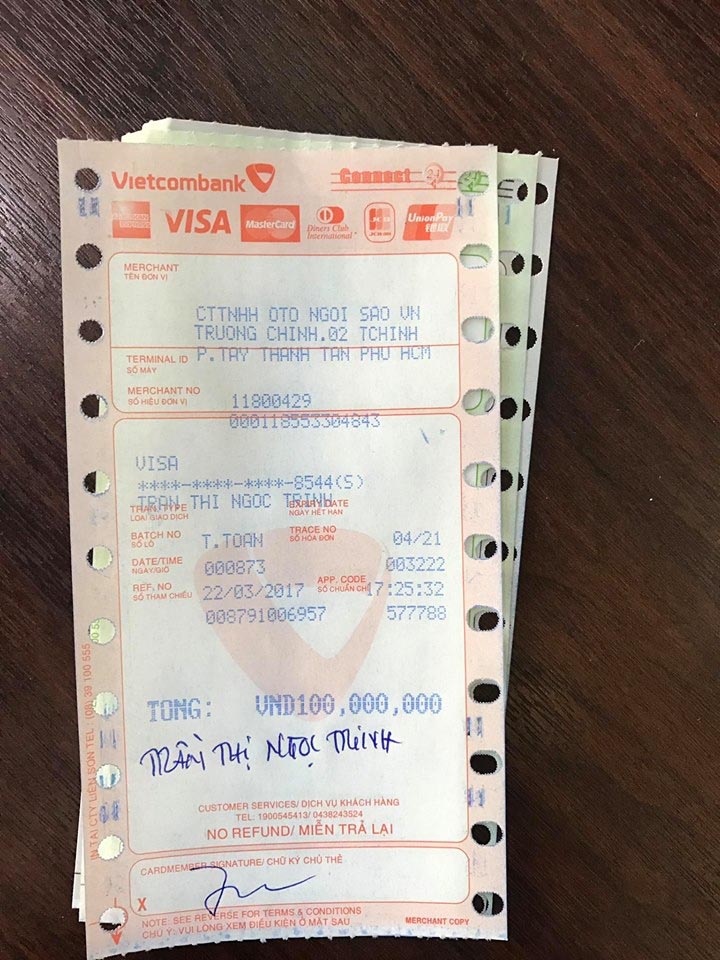 Những tờ phiếu chuyền tiền bằng thẻ Credit Card có chữ ký của Ngọc Trinh