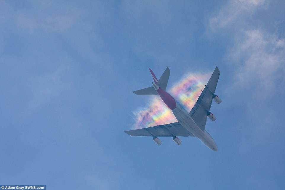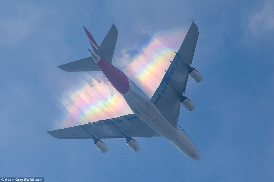 Daily Mail của Anh mới đăng tải một bức hình hiện tượng hiếm gặp. Cầu vồng được chụp đang "đuổi theo" chiếc máy bay. Hiện tượng chỉ xảy ra với những máy bay chở khách cỡ lớn như A380.