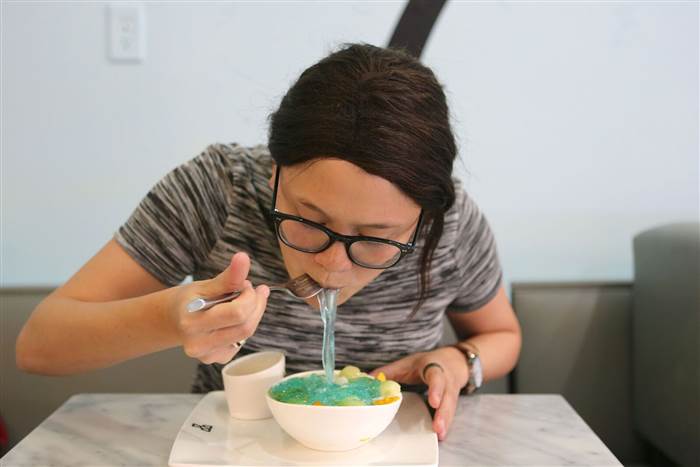Đây thực sự là phiên bản ngọt ngào của mì ramen, ngoại trừ cảm giác mát lạnh khi ăn, bạn có thể nhận ra đầy đủ các nguyên liệu cần có của một tô mì, gồm mì sợi, nước dùng, "thịt và trứng" (chính là dưa lưới và xoài).