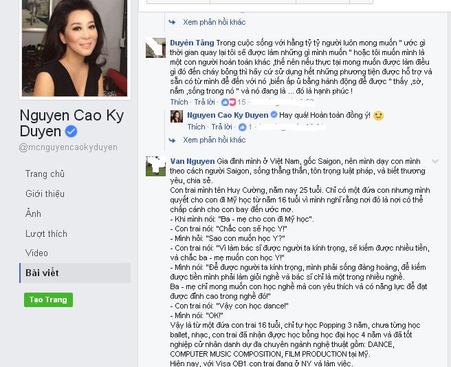 MC Kỳ Duyên lý giải việc ủng hộ quyết định của con vì cô cho rằng, một đứa trẻ 19, 20 tuổi luôn sống với gia đình ở nhà chưa có khả năng xác định được nó thích làm việc gì. Và vì nó chưa biết, chúng ta thường định hướng (và lắm khi ép buộc, áp đặt) nó học một ngành nghề gì mà chúng ta cho là an toàn và bổ ích. Đôi khi may mắn đó là con đường đúng. Nhưng...cũng có quá nhiều người, trong đó có bản thân cô học xong rồi để bằng đóng bụi ở đó, không dùng đến. Hoặc tệ hơn, có những người đi quá nửa đời người mới biết mình đã chọn sai con đường.