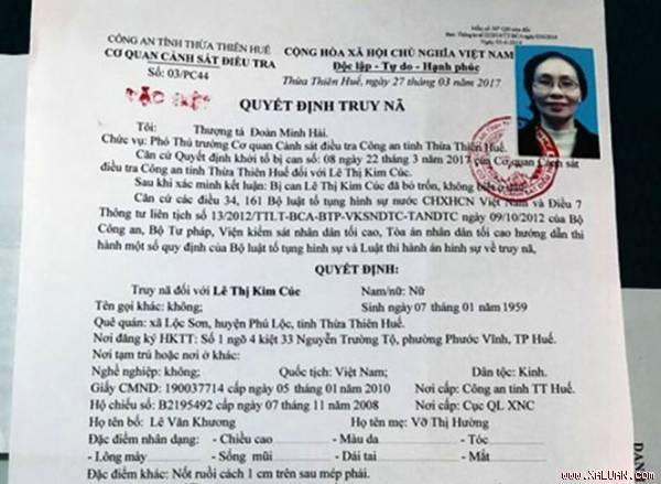 Chiều 17-4, đại tá Đặng Ngọc Sơn - Phó Giám đốc Công an tỉnh Thừa Thiên Huế cho biết cơ quan công an vừa ra quyết định truy nã đặc biệt đối với Lê Thị Kim Cúc (58 tuổi, thường trú phường Phước Vĩnh, TP. Huế, là giáo viên nghỉ hưu) về hành vi lạm dụng tín nhiệm chiếm đoạt tài sản.