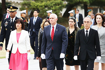 Phó Tổng Thống Mike Pence và phu nhân Karen Pence đã đến thăm đài Chiến Sĩ Trận Vong tại thủ đô Hán Thành, Nam Hàn. Nhân chuyến công du Nam Hàn và Nhật Bản, ông Pence nói rằng Hoa Kỳ sẽ không kiên nhẫn thêm nữa, nếu Cộng Sản Bắc Hàn không biết nghe lời và chấm dứt những hành động khiêu khích Tây Phương như bắn hỏa tiễn, thử nghiệm hạt nhân. (Chung Sung-Jun/ Getty Images)