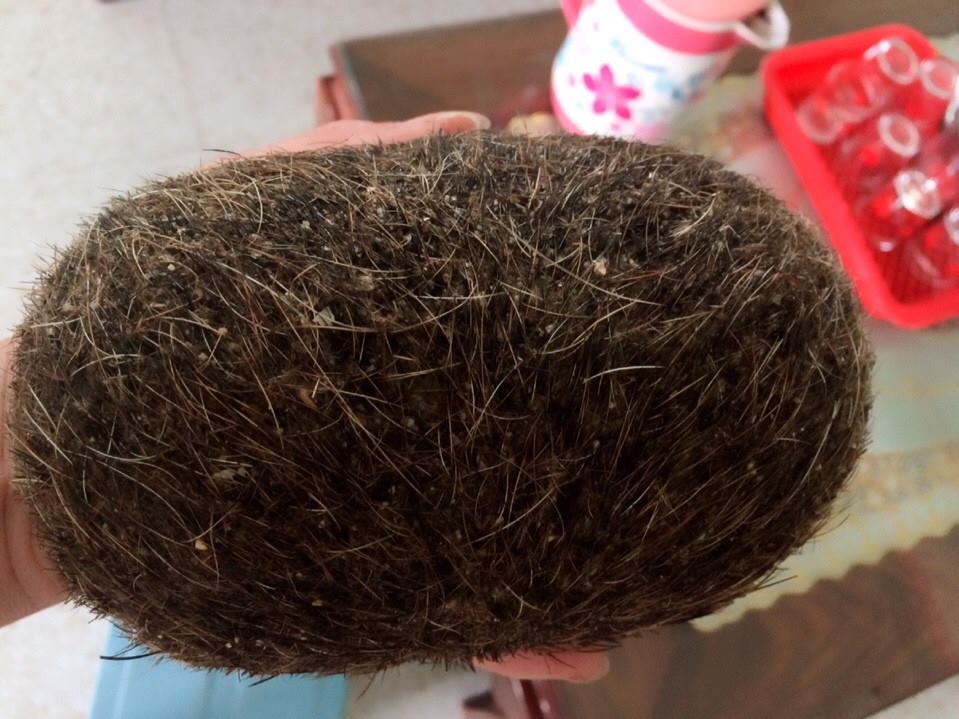 “Trong lúc mổ lợn, tôi bất ngờ phát hiện một vật lạ trong bao tử của con lợn. Thấy lạ, tôi đã bóc bỏ hết lớp mỡ bên ngoài thì lộ ra một "vật lạ" rất đẹp mắt. Vật thể hình bầu dục, dài gần một gang tay, nặng 0,9 kg; bên ngoài bao phủ bởi một lớp lông màu nâu rất dày”, anh Dương thông tin.