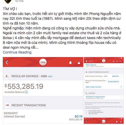 Anh Việt kiều Mỹ đăng tin tìm vợ nhanh chóng thu hút sự chú ý của cộng đồng mạng.Điều đáng chú ý ở đây là anh rất thẳng thắn khi chia sẻ lý do muốn tìm vợ Việt.Đồng thời anh còn tiết lộ khối tài sản triệu đô của mình.
