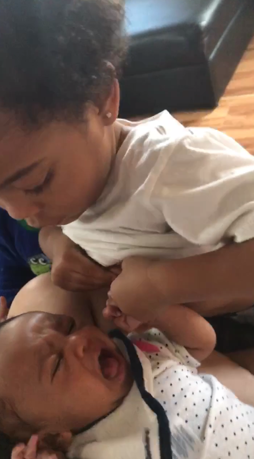Từ đoạn video có thể thấy trong khi em gái mới được 7 tuần tuổi đang liên tục quấy khóc, cậu anh trai 2 tuổi đã nhanh ý vạch áo cho em bú, nhằm xoa dịu sự khó chịu cũng như dỗ dành em nín khóc.