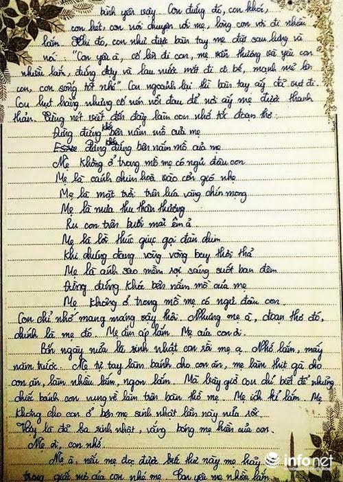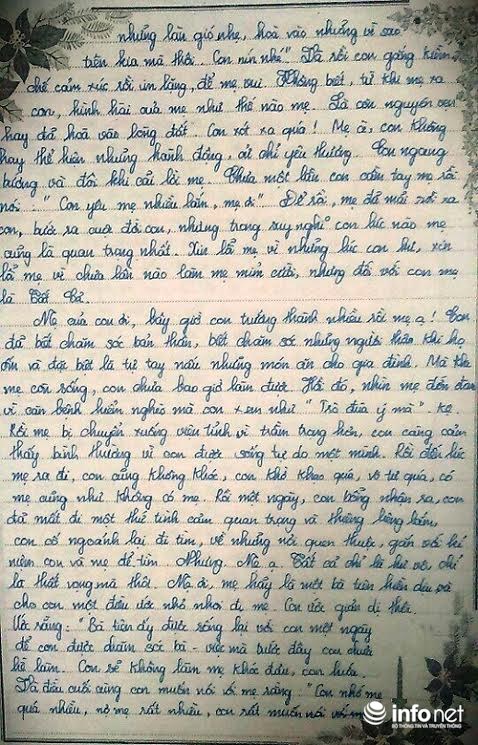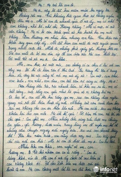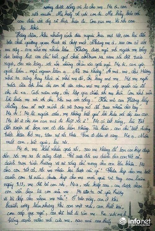Trong bức thư có đoạn em viết: “Mẹ ơi, mẹ khổ nhiều quá rồi, sao mẹ không để bọn con kịp đáp đền rồi mẹ ra đi cũng được. Cả cuộc đời mẹ dành cho con tất cả, dành trọn tình thương và sự sống chỉ mong cho con lớn khôn. Mẹ cho con tất cả, rồi mẹ nhận lại được cái gì? Chưa kịp cho mẹ bát canh con tự nấu, chưa kịp cho mẹ món quà tự tay con làm ngày 8/3…”.