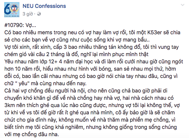 Cách đây chưa lâu, trên trang NEU Confessions đã đăng tải dòng chia sẻ của một anh chồng khiến rất nhiều người cảm động. Dù văn phong không mượt mà, lời lẽ cũng chẳng quá ngọt ngào, nhưng có lẽ chính sự giản dị mà chân thành này lại khiến cho những người đọc được, đặc biệt là các cô gái cảm thấy xúc động và ngưỡng mộ.