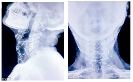 Thế nhưng, trong quá trình chụp X-quang để kiểm tra tổng thể, các bác sĩ đã vô cùng sửng sốt khi phát hiện có đến 75 chiếc kim đâm trên khắp người bệnh nhân, từ cổ, vai cho đến chân.