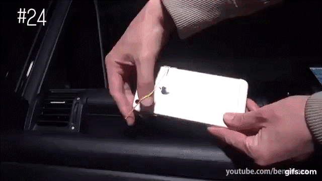 Khi đặt điện thoại ở những nơi rung lắc như trên xe hơi thì điện thoại rất dễ rơi xuống sàn. Lúc này chỉ cần bạn cột 2 sợi thun ở 2 đầu điện thoại.
