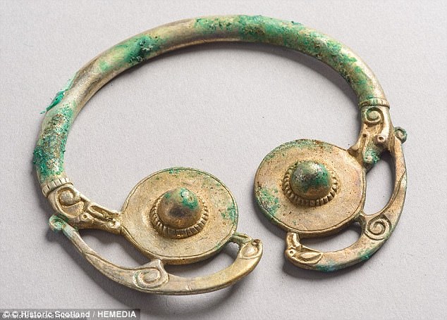 Chuyên gia dò tìm kim loại Derek McLennan đã phát hiện kho báu hơn 1.000 năm tuổi bao gồm xuyến và ghim hoa bằng bạc, nhẫn vàng, hình chữ thập bằng sứ và ghim cài hình chim bằng vàng , tại một cánh đồng ở miền tây Scotland vào năm 2014.