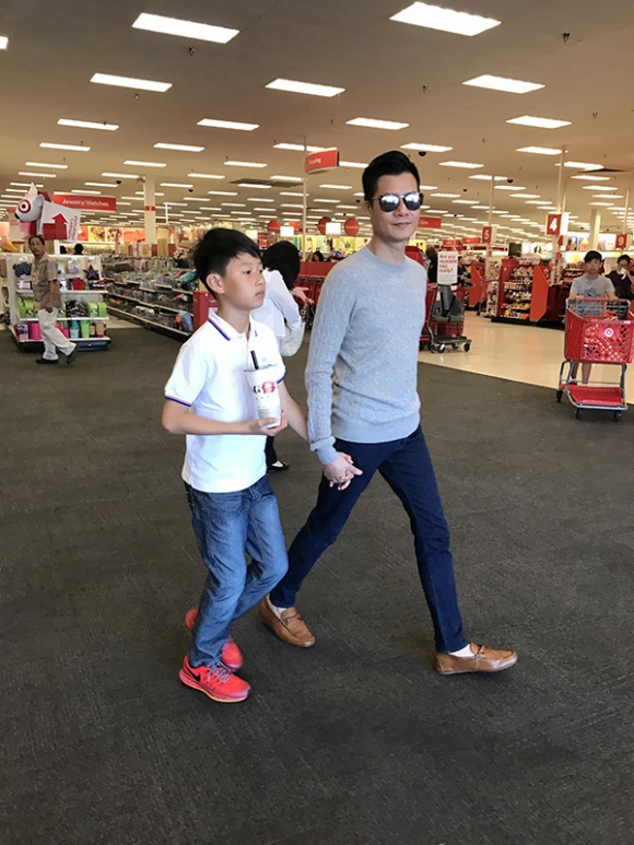 Quang Dũng tình cảm nắm tay con trai đi mua sắm