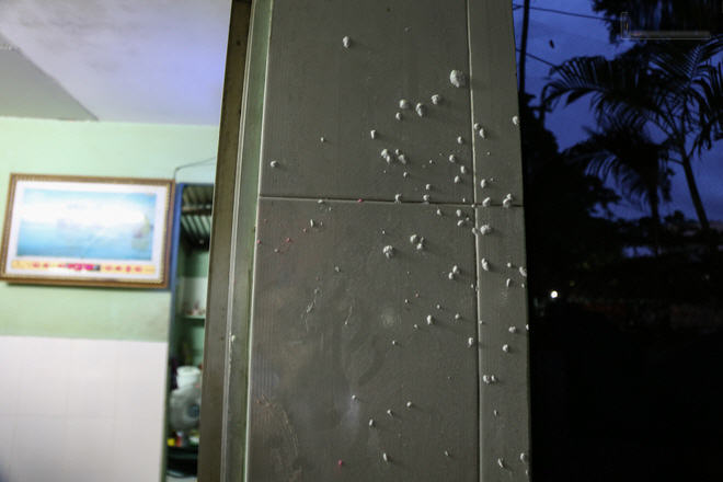 Do đã lường trước được sự việc nên khi thấy các em học sinh ném bột vào sân trường, bảo vệ đã nhanh chóng đóng cổng nhưng các em ấy vẫn tiếp tục ném bột vào sân. Lúc này bên trong sân trường chỉ có bảo vệ và các thầy giám thị, và cũng không trúng ai", bảo vệ trường cho hay.