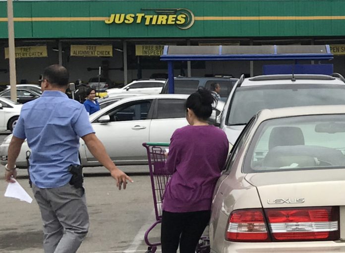 Cảnh sát chìm (bên trái) và người phụ nữ bị giật dây chuyền trước 99 Cents Only Store. (Hình: Khoa Lại/Người Việt)