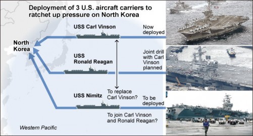 Các chuyên gia quân sự thế giới đang lý giải cho cvieecj Mỹ điều tàu sân bay hạt nhân thứ ba đến bán đảo Triều Tiên. Chưa bao giờ Mỹ hành động một cách rõ ràng như vậy. Đây có phải biến cố sắp xảy ra? Liệu có phải Mỹ đang chuẩn bị cho cuộc chiến khốc liệt với Bình Nhưỡng?