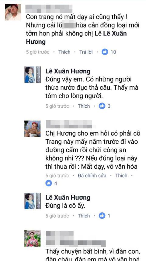 Tiếp đó, một Facebooker khác thắc mắc: "Chị Hương cho em hỏi có phải cô Trang này mấy năm trước đi vào đường cấm rồi chửi công an không nhỉ? Nếu đúng loại này th́ thua rồi: Mất dạy, vô văn hóa".
