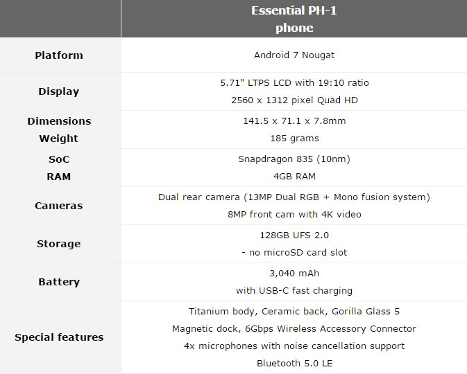 Các thông số kỹ thuật của smartphone Essential. Ảnh: Phonearena