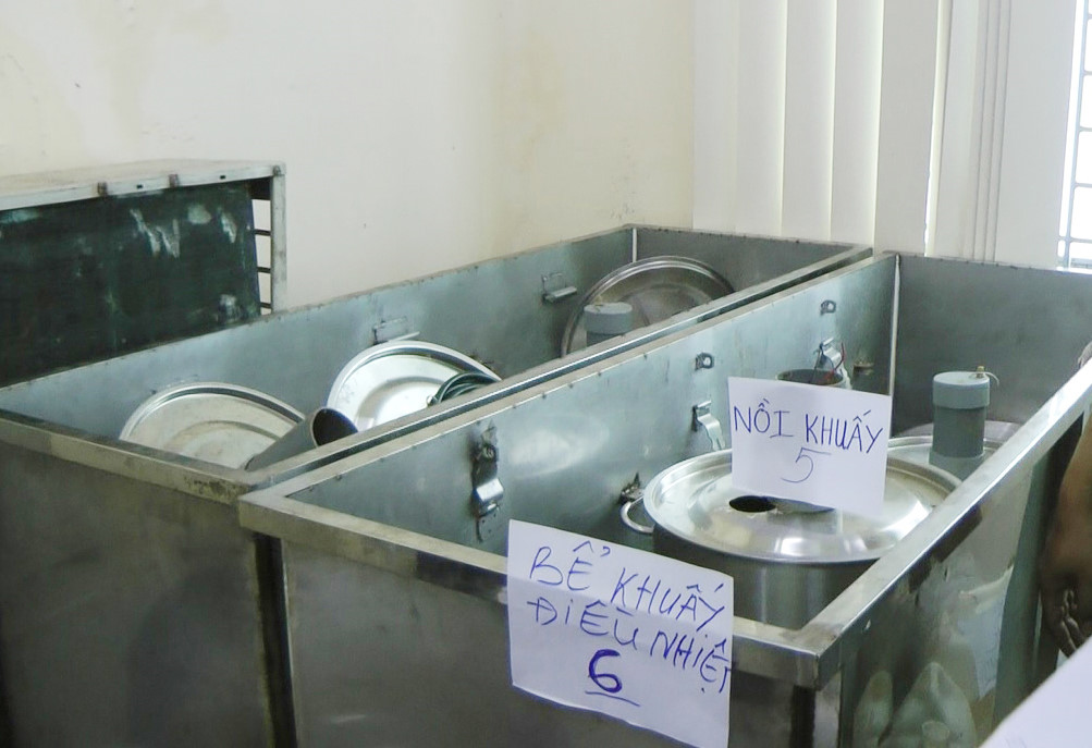 Sau đó, anh ta mang nồi khuấy bắc lên bếp ở bể khuấy điều nhiệt.