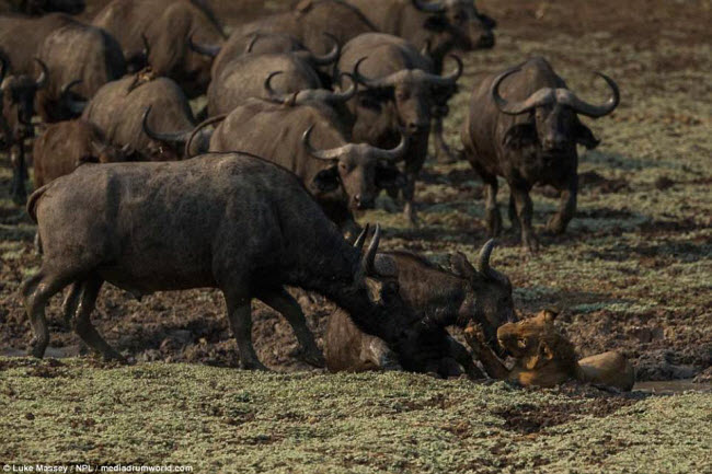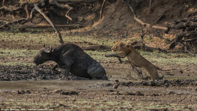 Nhiếp ảnh gia Luke Massey đến từ Anh quốc đã ghi lại cảnh tượng sư tử săn trâu rừng trong vườn quốc gia South Luangwa, Zambia. Con sư tử cái tưởng chừng sẽ dễ dàng hạ gục con trâu rừng yếu nhất đã bị tách ra khỏi đàn.