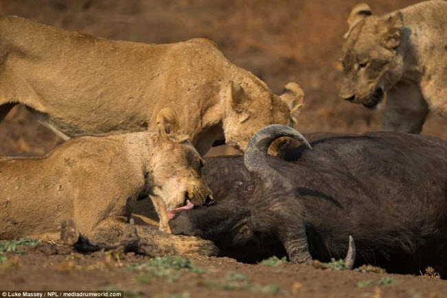 Ngay sau đó, các thành viên khác trong đàn đã tới hỗ trợ con sư tử để giết chết trâu rừng và cùng ăn thịt con mồi.