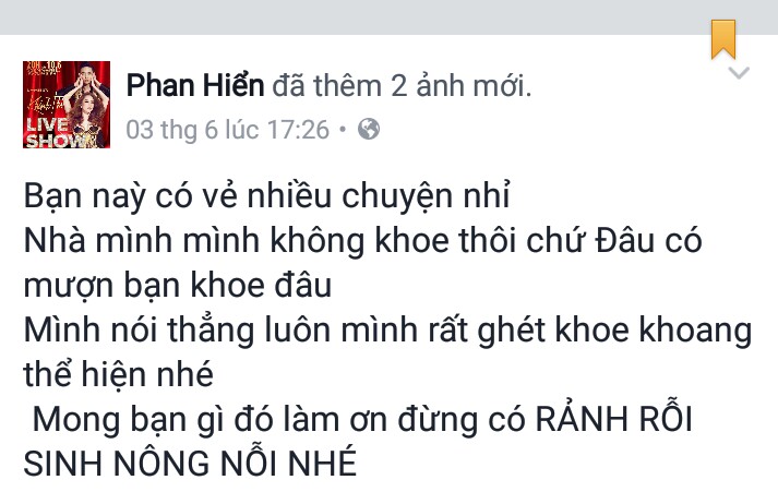Trước ý kiến chủ quan, áp đặt vầ soi mói của cư dân mạng này, Phan Hiển đã ngay lập tức lên tiếng: "Bạn này có vẻ nhiều chuyện nhỉ. Nhà mình mình không khoe thôi chứ. Đâu có mượn bạn khoe đâu. Mình nói thẳng luôn mình rất ghét khoe khoang thể hiện nhé. Mong bạn gì đó làm ơn đừng có rảnh rỗi sinh nông nổi nhé".
