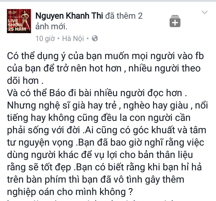 \ cũng nhắn gửi sâu xa đến co gái này: "...Nhưng nghệ sĩ già hay trẻ, nghèo hay giàu, nổi tiếng hay không cũng đều là con người cần phải sống với đời. Ai cũng có góc khuất và tâm tư nguyện vọng. Bạn đã bao giờ nghĩ rằng việc dùng người khác để vụ lợi cho bản thân liệu rằng sẽ tốt đẹp. Bạn có biết rằng khi bạn hỉ hả trên bàn phím thì bạn đã vô tình gây thêm nghiệp oán cho mình không?".