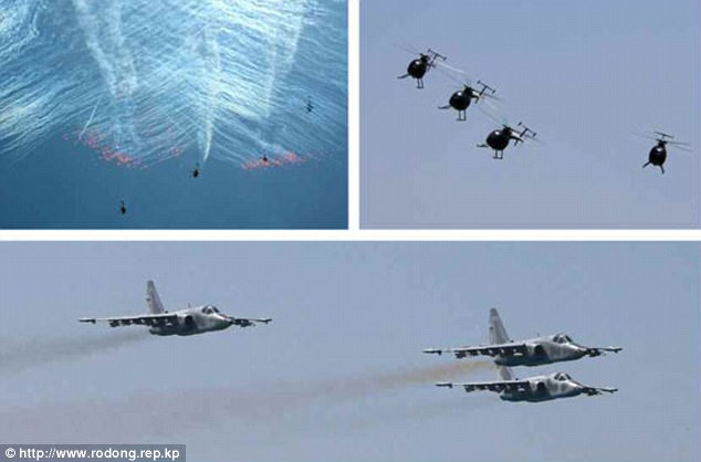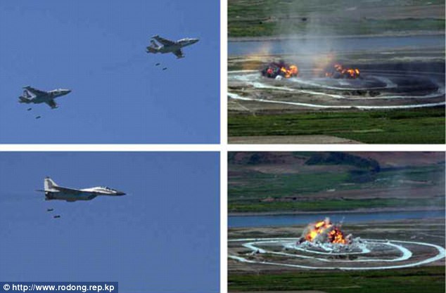 Hình ảnh công bố cho thấy nhiều vụ nổ lớn trên mặt đất diễn ra sau khi máy bay ném bom từ bầu trời. Daily Mail cho biết ông Kim có mặt từ 9 giờ sáng để xem màn trình diễn của quân đội Triều Tiên. Ông Kim dặn dò binh sĩ “bay thấp, đột ngột vút lên cao và tấn công mục tiêu là yêu cầu rất quan trọng trong chiến đấu”.