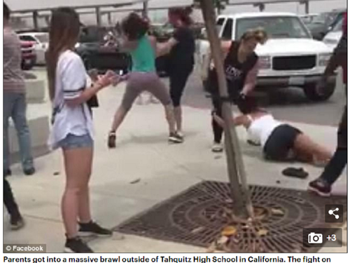 Một đoạn video ghi lại cho thấy một số phụ huynh la hét, túm tóc rồi đấm vào mặt đối phương. Vụ đánh nhau xảy ra vào ngày 31.5, trước Trường trung học Tahquitz ở thành phố Hemet, bang California, Mỹ, theo Daily Mail.