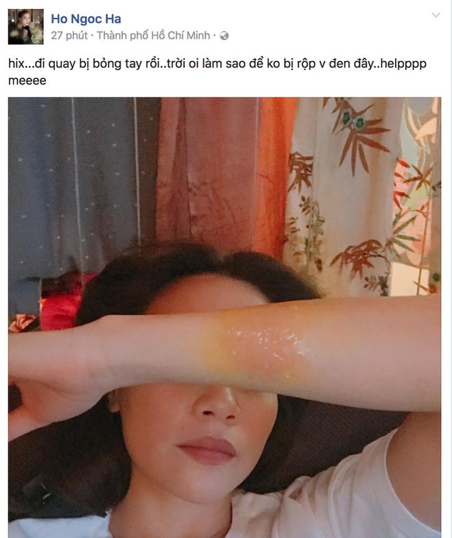 "Đi quay bị bỏng tay rồi. Trời ơi làm sao để không bị rộp và đen đây, help me" là lời chia sẻ của Hồ Ngọc Hà tới bạn bè và các fan. Nữ ca sĩ tỏ ra lo lắng bởi vết bỏng trên cánh tay trái. Trong hình, vết bỏng của Hồ Ngọc Hà đỏ ửng và khá to. Điều mà nữ ca sĩ lo sợ nhất chính là phần da ở chỗ bỏng khó có thể phục hồi như xưa.