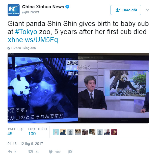 Các quan chức tại vườn thú Ueno ở Tokyo xác nhận cô gấu trúc khổng lồ Shin Shin mới đây đã sinh hạ được một chú gấu con xinh xắn. Tin tức này ngay lập tức đã được hãng Truyền hình quốc gia NHK gửi một bản tin khẩn đến nhiều kênh tin tức để nó nhanh chóng đến được với toàn bộ người dân Nhật Bản.