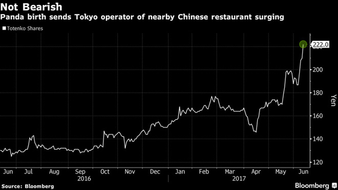 Cụ thể, cổ phiếu của Totenko, tập đoàn sở hữu quán ăn Trung Quốc chỉ trong phạm vi đi bộ từ sở thú, tăng đến 38%, còn của nhà hàng ẩm thực Pháp Seiyoken tăng 11%. Cổ phiếu của cả hai công ty đã tăng mạnh trong tháng hai vừa qua, khi sở thú tuyên bố rằng cặp đôi chú gấu trúc đang chuẩn bị đón thành viên thứ 3. Nikkei đã ước tính tác động kinh tế của chú gấu trúc con này có thể lên đến 26,7 tỉ yên (tương đương với 5,5 nghìn tỷ đồng).