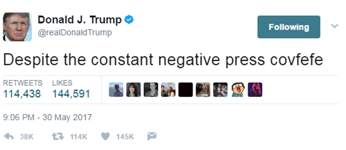 Tổng thống Trump hôm 29/5 viết trên Twitter "dù báo chí liên tục tiêu cực 'covfefe'", thu hút sự chú ý của người dùng mạng xã hội. Họ cho rằng đây có thể là từ viết tắt, thông điệp bí mật hoặc đơn giản chỉ là do Tổng thống Trump gõ nhầm. Ông chủ Nhà Trắng sau đó xóa từ này khỏi Twitter cá nhân.