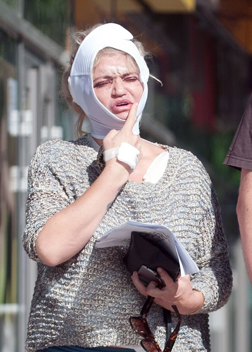 Danniella Westbrook rời khỏi phòng khám ở thành phố Wroclaw, Ba Lan với băng gạc quấn đầy mặt. Cô vừa trải qua cuộc phẫu thuật kéo dài 6 tiếng để cứu gương mặt không bị chảy xệ và biến dạng.
