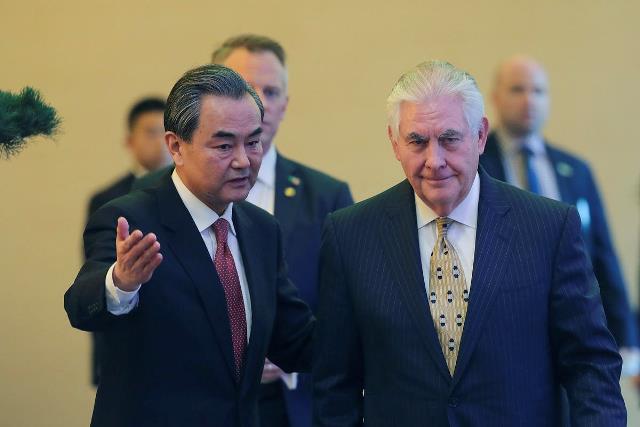 Ngoại trưởng Mỹ Rex Tillerson trong lần gặp với người đồng cấp Trung Quốc Vương Nghị. Ảnh: AP