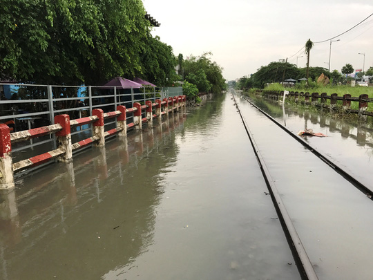 Đường ray xe lửa mênh mông nước. Theo ông Hồ Hoàng Sỹ, nhân viên gác chắn tại đoạn đường ngang này, do ảnh hưởng bởi tình trạng ngập sâu, Khu gian Bình Triệu – Sóng Thần phải phong tỏa trong gần 1 giờ, làm đôi tàu SPT1/2 bị trễ giờ