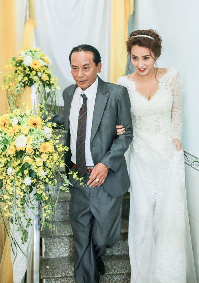 Hải Băng mặc váy cưới, khoác tay bố xuất hiện trong lễ đính hôn.