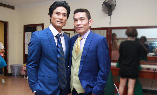Ba cha con Chế Linh cùng bàn bạc với MC Kỳ Duyên về kịch bản chương trình ở phòng chờ.