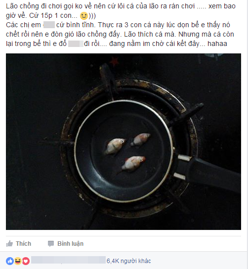Các chị em cứ bình tĩnh. Thực ra 3 con cá này lúc dọn bể em thấy nó chết rồi nên đòn gió lão chồng đấy. Lão thích cá mà. Nhưng mà cá còn lại trong bể thì em đổ đi rồi, đang nằm im chờ cái kết đây, haha", chia sẻ của người vợ.