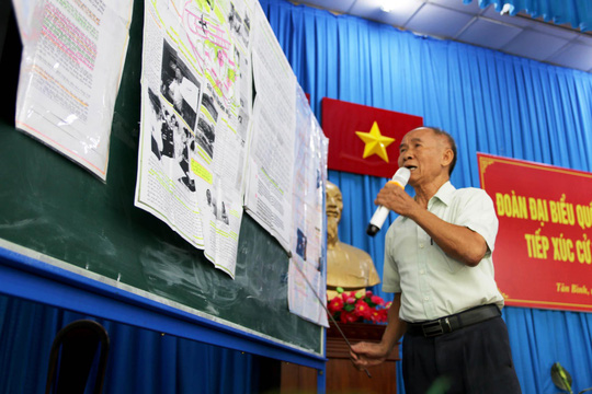 Cử tri Phan Tương, 92 tuổi, cho biết ông nguyên là Giám đốc sân bay Tân Sơn Nhất nhưng muốn vào sân golf và bên hông sân bay để nắm bắt tình hình thì bị cản trở. "Kỳ lạ thật, sân golf gì mà có lính canh, an ninh nghiêm ngặt. Chỉ có hoạt động mờ ám, sai trái mới sợ người khác vào giám sát như vậy" - ông Tương bức xúc. Ông Tương đặt câu hỏi cho toàn bộ những người có mặt tại hội trường: "Có cán bộ nào xấu hổ khi thấy máy bay vòng vòng trên bầu trời, dưới đất thì kẹt xe, mưa xuống thì ngập sân bay không? Nếu để tình trạng này kéo dài, chắc chắn sẽ xảy ra chuyện. Lúc đó, mất bò rồi mới lo làm chuồng".