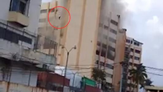 Trong lúc hoảng loạn, một người đàn ông đã quyết định nhảy từ trên tầng thượng của tòa nhà đang cháy. Đoạn video ghi lại tại hiện trường cho thấy nạn nhân rơi xuống mái của một tòa nhà thấp hơn.
