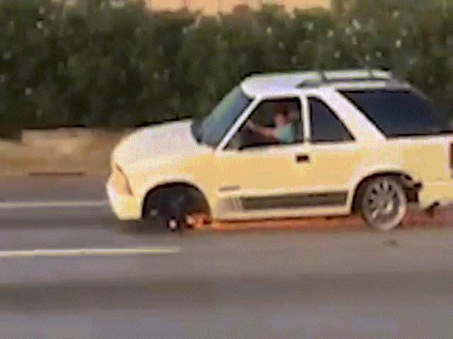 Một chiếc xe hơi vẫn chạy băng băng mặc dù mất 2 bánh. Chiếc ô tô bị mất bánh trước và lốp sau. Tuy nhiên, nó vẫn chạy bon bon cùng các phương tiện khác trên đường.