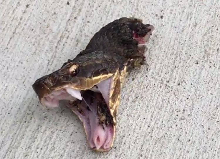 Trong video được bà Mollett đăng trên Facebook, chiếc đầu đứt lìa của con vật tiếp tục ngọ nguậy và há rộng miệng để lộ ra răng nanh chứa đầy nọc độc.