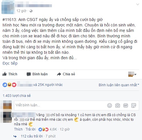 Một bạn nữ có tên N.T.P.T cũng vui vẻ góp lời:“Lại nhớ lần chưa có bằng mà vẫn lấy xe máy đi họp lớp. Khi đó ḿnh đi sai làn nên bị anh cảnh sát gọi vào hỏi bằng. Sợ quá nên ḿnh nói dối để quên ở nhà, xong anh ấy hỏi bằng lái xe màu ǵ, xanh hay đỏ. Chưa biết bằng có màu ǵ nên trả lời đại màu đỏ. Thế là bị ông ấy dùng dùi cui gơ lên mũ một phát, bảo không có bằng mà xạo, bằng lái xe màu vàng. Nhưng may lần đó được cho qua, chả phải nộp phạt ǵ cả. Hôm nay đọc xong bài này tự dưng lại nuôi mộng tưởng. Anh CSGT ngày ấy ơi, anh có theo dơi page này không?”.