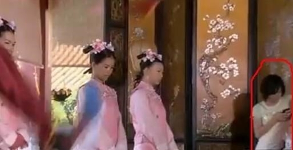 Một nhân viên của đoàn làm phim đang sử dụng điện thoại "lọt thỏm" vào khuôn hình trong một cảnh quay của "Cung tỏa tâm ngọc".