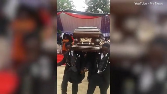 Trong video mới xuất hiện gần đây, những người khiêng quan tài ở Ghana, châu Phi vỗ tay và dậm chân trong một điệu múa hoang dã, tưởng niệm cuộc đời của người đã chết.