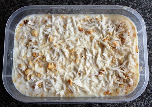 - Bước 3: Bạn cần dùng một chiếc hộp kem to và chỗ nguyên liệu mình chuẩn bị ở trên là vừa đủ cho một hộp này luôn nhé. Bạn bắt đầu múc 1 muôi hỗn hợp đã trộn ở bước 2 vào hộp rồi tiếp tục xếp 1 lớp chuối lên trên và rắc tiếp 1 lớp lạc rồi lại đến lớp dừa nạo sơi…