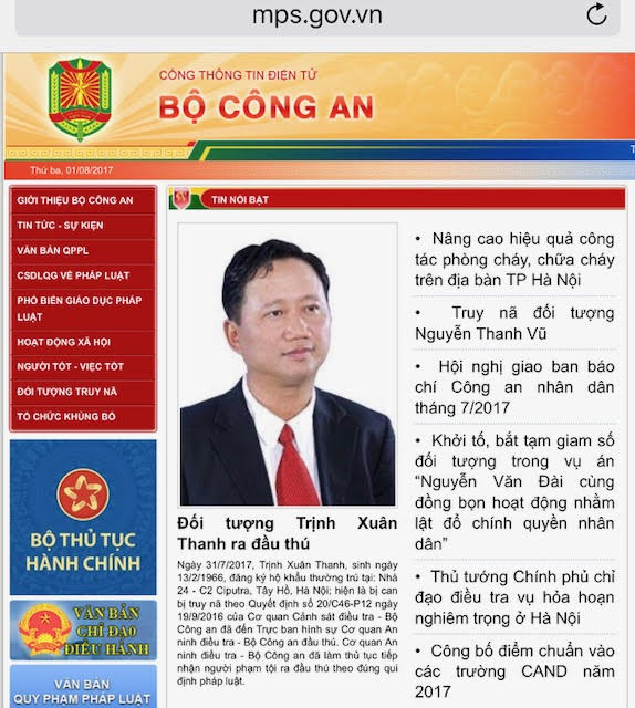 Thông tin về đối tượng Trịnh Xuân Thanh đă ra đầu thú trên Cổng Thông tin điện tử Bộ Công an