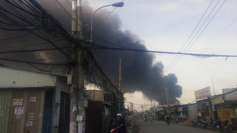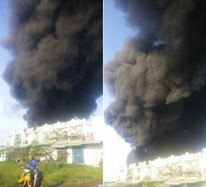 Chỉ trong tích tắc, lửa lan nhanh bao trùm nhà xưởng kèm theo cột khói đen bốc cao cả trăm mét. Đứng xa khu vực cháy 5km vẫn có thể nhìn thấy cột khói đen ngòm.