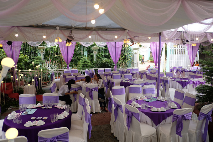 Toàn bộ không gian lễ cưới được trang trí sắc tím.